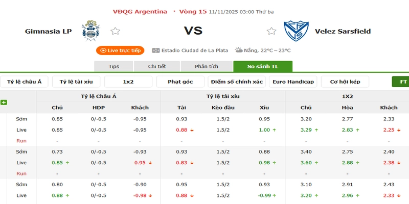 Tỷ kệ kèo Gimnasia LP vs Velez Sarsfield